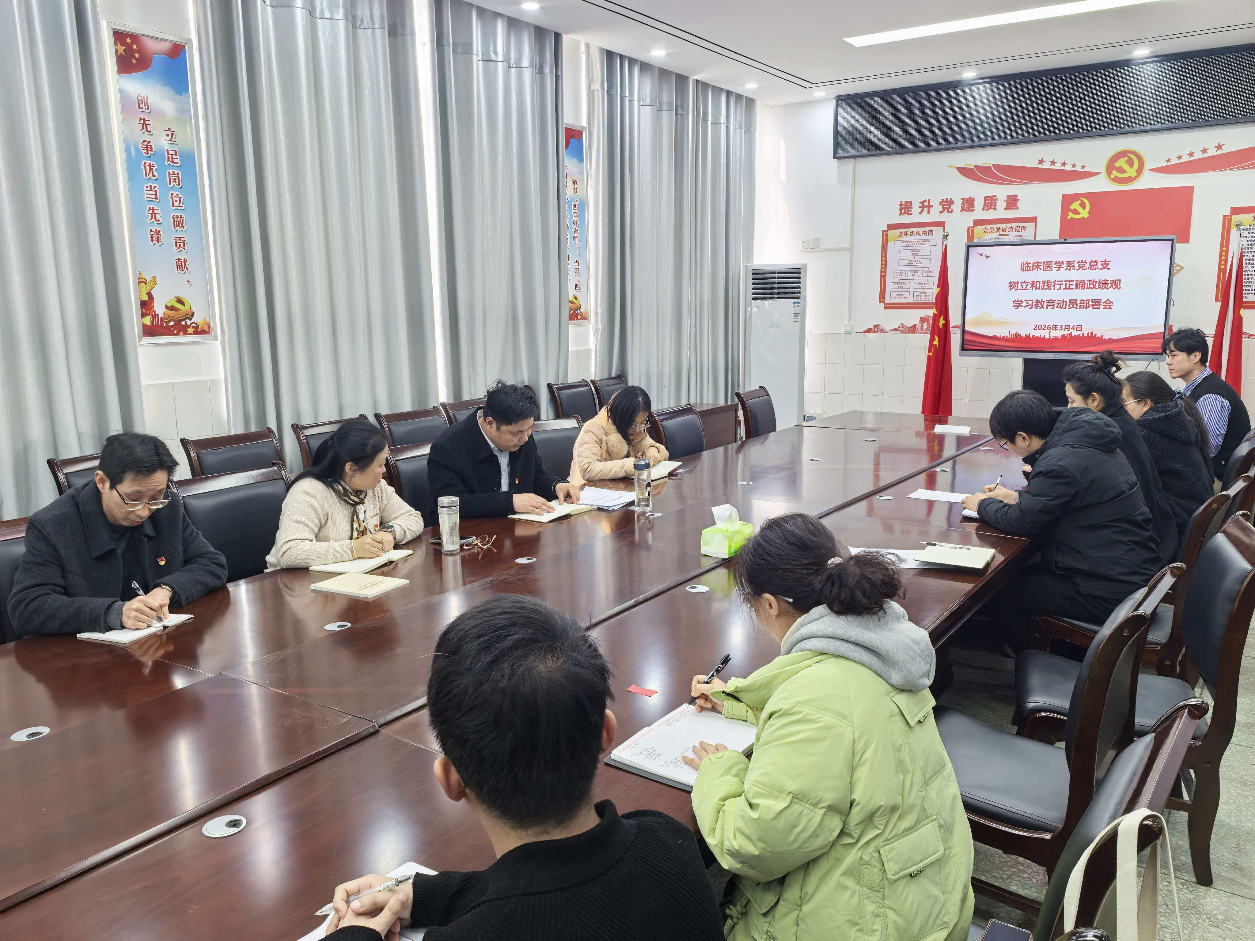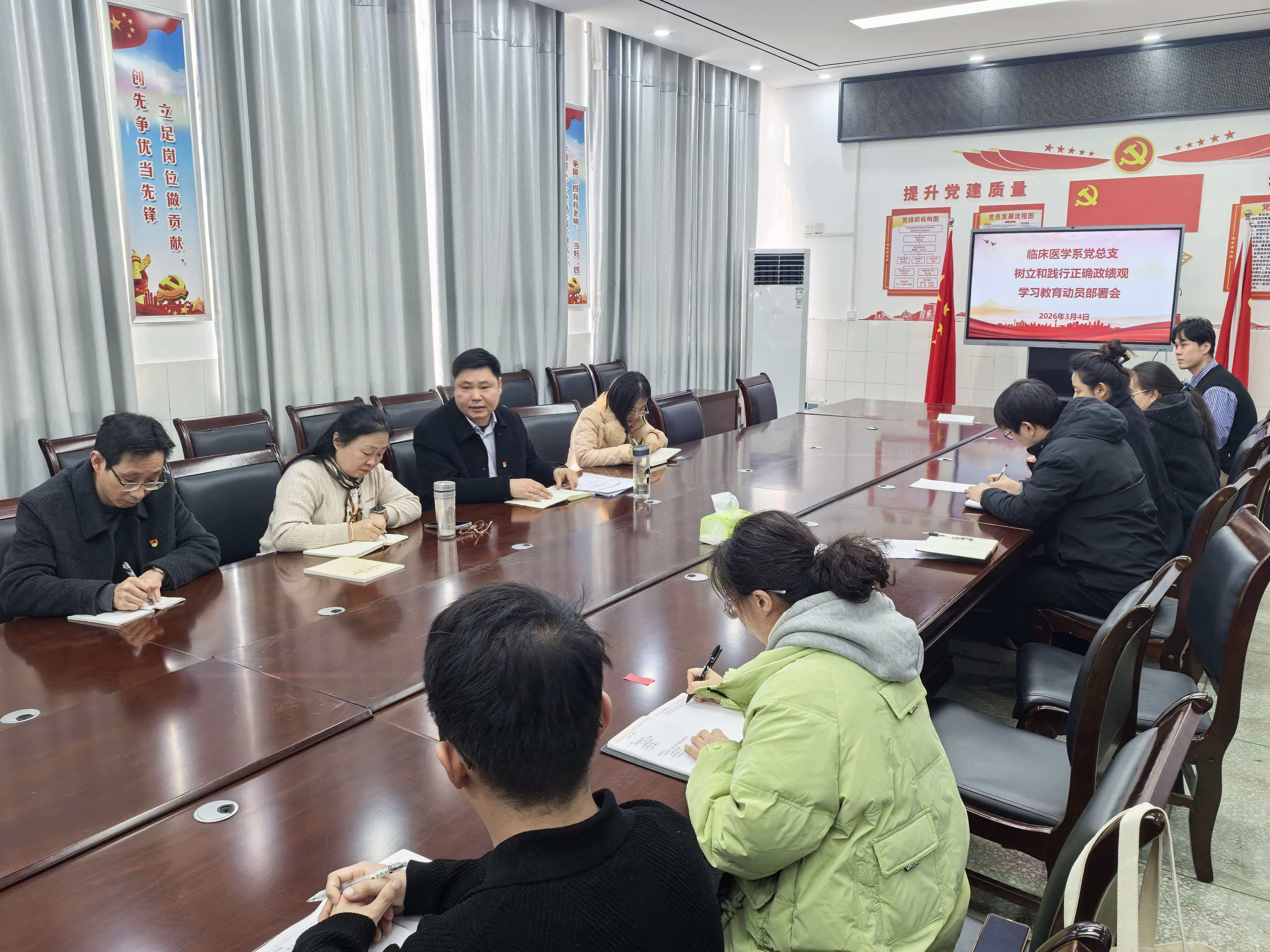 3月4日,临床医学系党总支在4号教学楼408会议室召开树立和践行正确政绩观学习教育启动部署会,全体党员同志参加,会议由临床医学系党总支书记张辉主持。