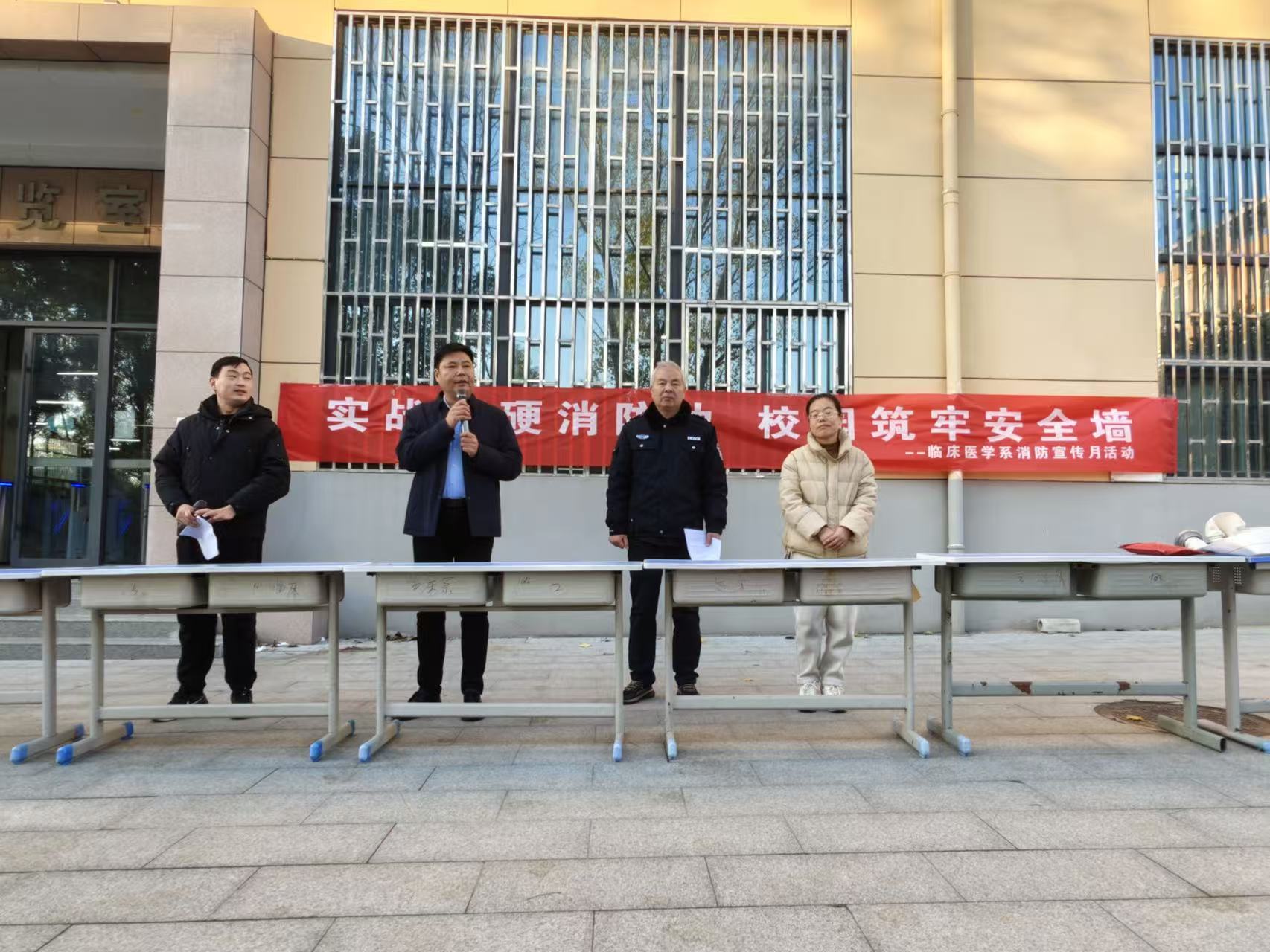 活动伊始,临床医学系党总支书记张辉上台致辞。他强调,冬季安全隐患突出,消防安全作为校园安全核心,直接关乎师生生命安全。此次演练旨在让全体师生掌握消防工具使用技巧,助力平安校园建设。同时,张书记对全体师生提出两点要求:一是服从指挥,按流程有序参与;二是高度重视,以实战心态投入,做到学会、练熟、会用、能讲。